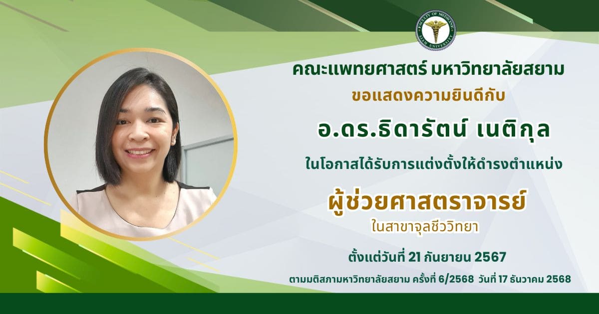 คณะแพทยศาสตร์ มหาวิทยาลัยสยาม > faculty-event > ขอแสดงความยินดีกับอาจารย์ธิดารัตน์ที่ได้รับตำแหน่งทางวิชาการ